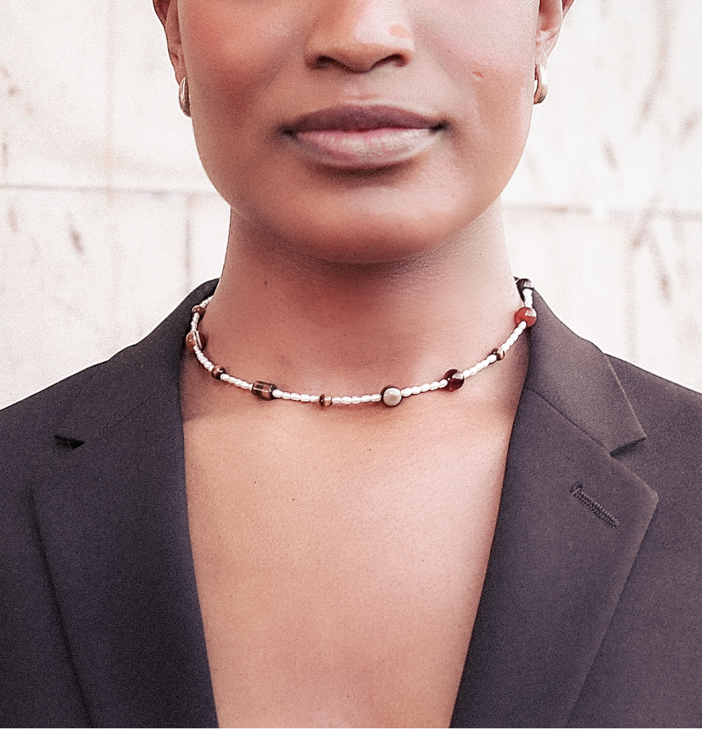 Featuring rare micro rice pearls, brown striped agate and tiger eye.