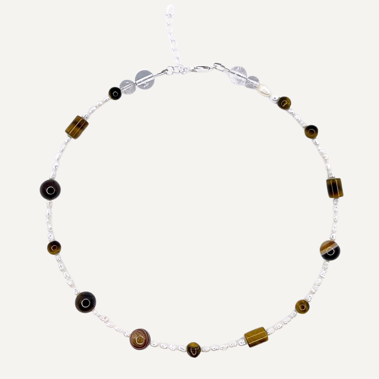 Featuring rare micro rice pearls, brown coffee striped agate and tiger eye. This makes for an elegant and unique autumnal accessory.