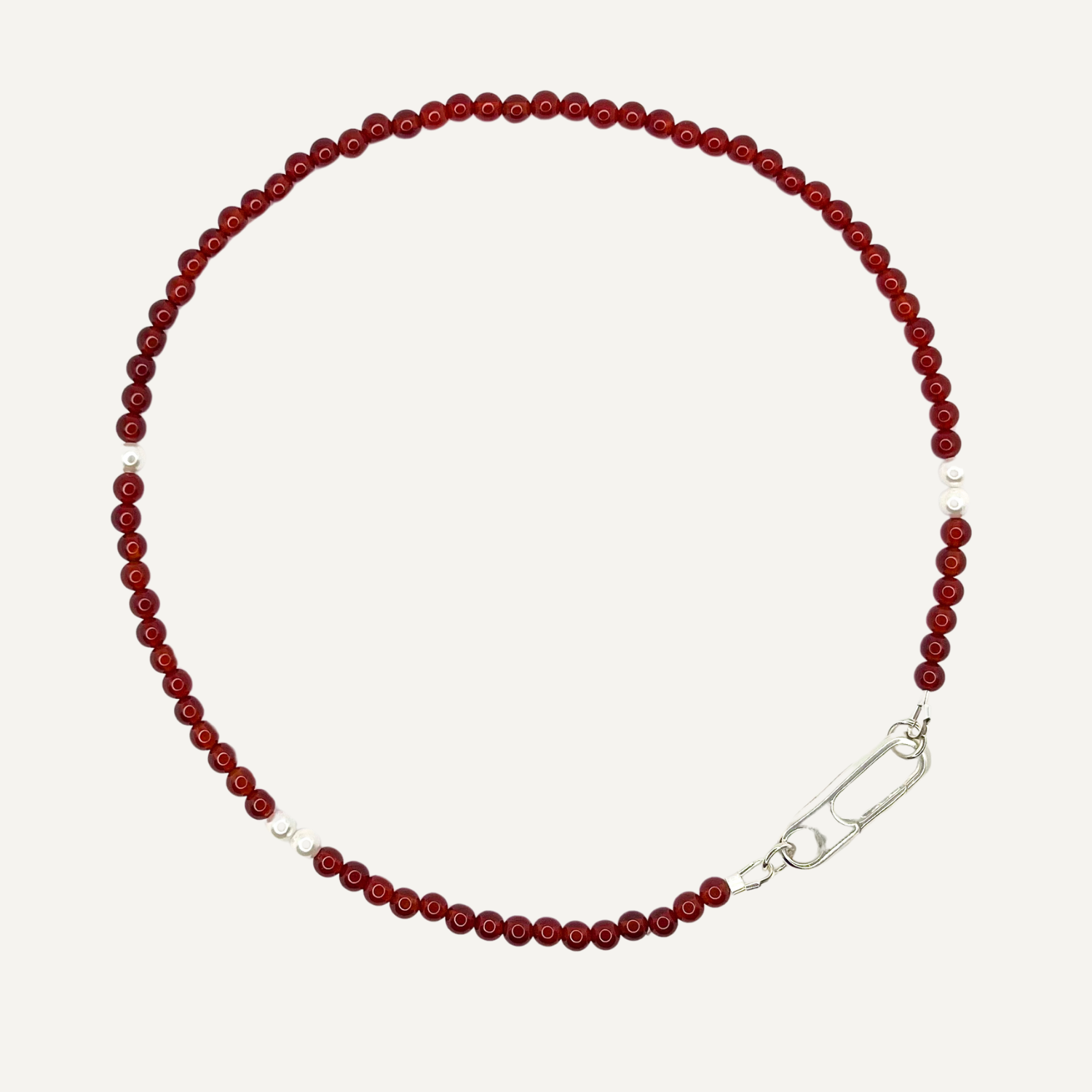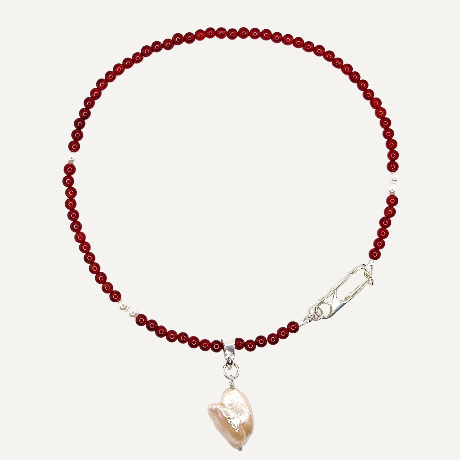 The unique and moody choice. Featuring red agate, river pearls and a 925 sterling silver paper clip clasp. Wear without the baroque pearl for an understated accessory, or slide on the sterling silver bail for a striking combination.