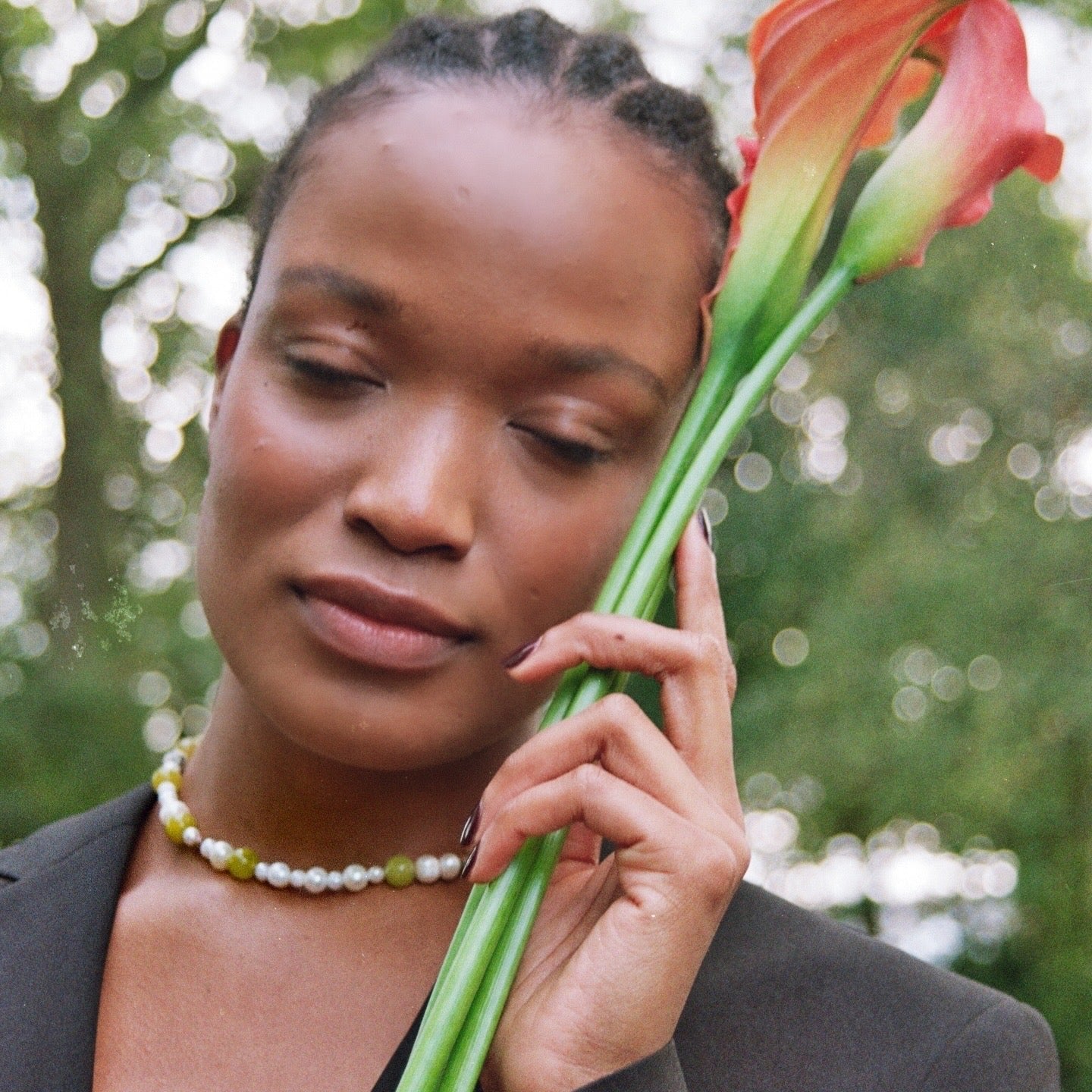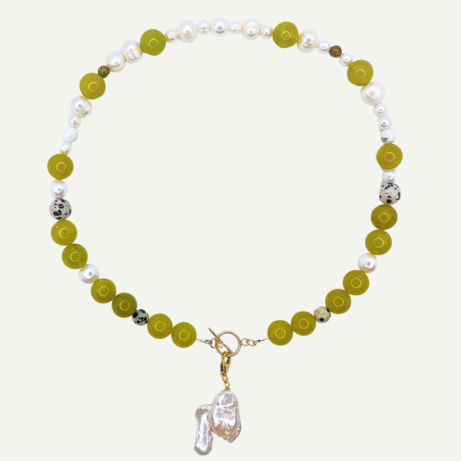 Designed for versatility; detach the baroque pearl and wear the clasp front or back for a more casual style, or attach for a statement evening look. Featuring striking green peridot, dalmatian jasper and river pearls.